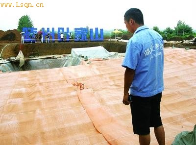雨越下越大,覆盖在墓坑上的塑料雨布上已开始积水。“哗”的一声水响,吸引了所有人的目光,原来是M111号墓坑上的两块雨布连接处开了一条缝,水流了进去,大家都在为墓坑里的文物担忧。wwW.LSqn.cn现场工作人员迅速进行了处置,及时用雨布覆盖缝隙。
