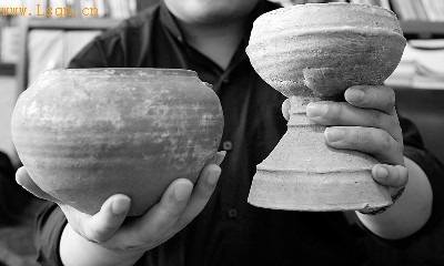 “平民家的墓里不可能出现陶豆,只有级别在专使以上的达官贵人的墓里才会有。WwW.lSqN.cn”工作人员初步判断,两件陶器为汉代物品,但是周边暂时没有发现古墓葬痕迹。 (记者 蒋桂佳 新闻观察员 徐娜)