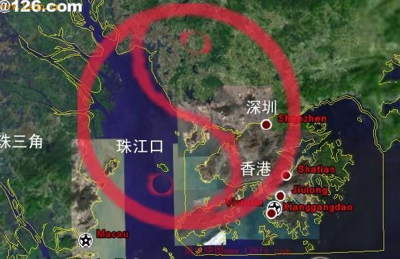 那么,我们把范围再扩大一点来看全局。看一个城市的风水,就要从整体着眼,放大看,缩小看。总之从大到小的看,然后又从小到大的看。图中的太极圈内,把香港、深圳、珠江口都圈在里边了。这一圈范围中,为一个大局,合一太极。看吧,还是看了再说——