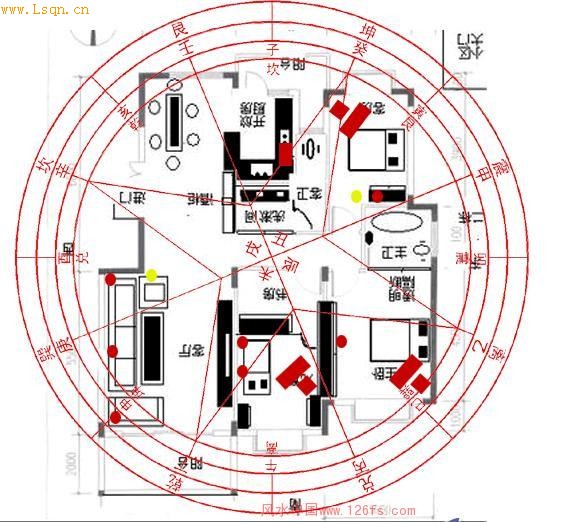 A模式基本评测内容,按自己的使用要求有些位置可选有些位置亦可放弃。 缺角:乾兑艮,补缺方式见后,不缺则无需补。 冲如下:两厅窗遥冲,东侧两卧室门对冲,主卫门冲床,黄圆处角冲或刃冲(未标则无),化冲方式见后 红方灶位 红圆财位 文昌如图大小两个红方处是桌椅摆放方式,未标则无。
