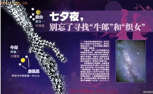 在两颗星的中间隔着一条横贯南北的白茫茫的天河(银河),其中牛郎在河东,织女在河西,它们无言相望,颇有一番诗情画意。织女星的下方有四颗较暗的星,组成小小的平行四边形,它们就是神话传说中织女编织的美丽云霞和彩虹的梭子。牛郎星是颗微黄色的亮星,在它两边的两颗小星叫扁担星,传说中牛郎挑着一对儿女。