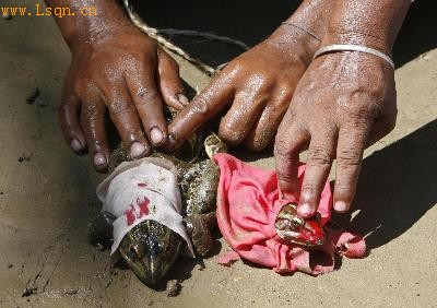 中国日报网环球在线消息:为祈雨缓解当地干旱缺水的局面,印度西孟加拉邦的一个村庄上周为两只青蛙举行了盛大的“结婚仪式”,3000人参加了这场婚礼。