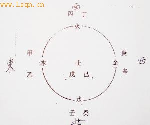 干支的产生和运用比阴阳、五行、八卦更早,最初干支是用来纪年、纪月、纪时的,后来和五行观念相配合,用于看相、算命和占卜。上面说到,五行是用来表示世界上五种物质问的相互关系(生、克关系)的,而它实际的变化却是很复杂的,于是单用五行已无法表示这种变化,于是古人又采用十种符号甲、乙、丙、丁、戊、己、庚、辛、壬、癸,并按照五行的方位将其加以排列,如图5: