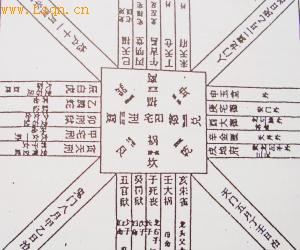 八卦的阴阳直接关系到住宅的建造方位,按照卦理,乾、坎、艮、震属于阳位,即从西北乾位到震位为阳明;巽、离、坤、兑属于阴位,即从东南巽位顺时针到兑位为阴明,阳宅不宜修在阴方,要修在阳方,即东方和北方较为适宜。而阴宅最好修在西方和南方。阳宅要阳气抱阴,阴宅要阴气抱阳。中国汉族在住宅建造中最讲究龙脉,认为阴阳之宅犹如龙,阳宅龙头在亥,尾在巳,阴宅龙头在巳,尾在亥。从东面的辰南之位到西面的戌北之位,划一条线就是阴阳之界。这样西北方向有天门,东南方向有地户,住宅的大门一般设在地户方向。而东北方向是鬼门,西南方向是人门,这一方向是不宜设大门的。如图7: