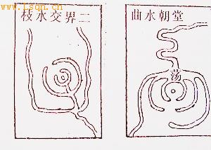 风水术讲究水随山而行,山界水而止。风水家认为,凡水来处谓之天门,若来不见源流谓之“天门开”;水去处谓之地户。不见水去谓之“地户闭”。水是主财的,门开则财来,户闭则财运不竭。由此生发出中国风水的水口理论。风水关于水的要求以“曲水为上”。尤其是在没有山的平原地区,风水家对水的要求似乎更显重要,这就叫“有山处用山,有水处收水”。在无山的地方,水代表山。也可以成为龙脉。在具体实施中,无论阳宅或阴宅,都希望水的形状弯弯曲曲,不要太平直。大江大河虽有湾抱,但其气浩渺,与阳宅和阴宅均不亲,所以最好是在支流上选址,而且要选在水流回绕之处。《水龙经·论形局》中说:“水见三弯,福寿安闲。屈曲来朝,荣华富饶。”许多风水著作中都讲到“曲水有情”,这是因为曲水可以聚气的原因。如图9: