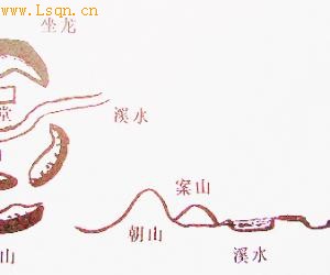 想。具体到风水中阳宅、阴宅对周围环境的选择,历来讲究“山环水抱”,认为“山环水抱必有气”。山环指三面或四面环山。层层环山虽是最好的地形,甚至可以延及十代子孙,但也要看明堂与周围山势的关系。如《风水十代歌诀》所说:“初代明堂在本宫,土角分明出富翁,水秀湾环主贵子,兀伸直出主单丁。二代严关看两边,连口久车土方圆,两边秀气方为贫,无土硬直绝人丁……”从地形的方位上讲,山势方位要与五行、四象(四兽)相配合,构成所谓左青龙(木)、右白虎(金)、前朱雀(火)、后玄武(水)。一般来讲坐龙为玄武,山形要高昂而秀丽,青龙、白虎为砂山,要根据风向一高一低,如风从东方来,青龙高于白虎;如风从西方来,则白虎高于青龙。南方的案山和朝山,也称砂山,是朱雀位置的所在。用图表示则为图8: