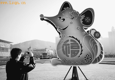 为迎接鼠年来临,大连在星海湾广场竖立了5个形态各异并镶嵌霓虹灯的“老鼠”。