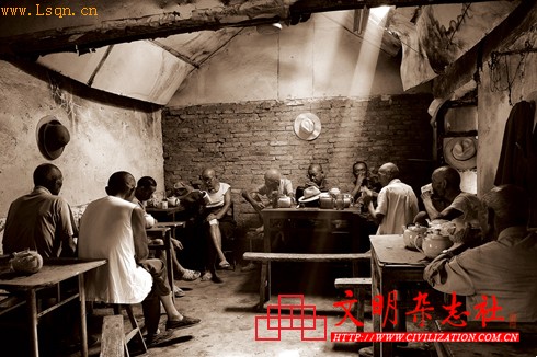 这里还有一种与众不同之处,就是在这里喝茶的人不是几个人共叫一壶茶,各自用自己的小杯喝,而是一个人叫一壶茶,然后拿上一个瓷杯,自酌自饮。茶价更是低廉,多为三毛钱一壶,五毛钱一壶的,算是贵的了。一壶棒棒茶可以随心随意地喝到任何时辰,一壶水喝干,自有茶老板续上,加水不加钱。只要你有时间,只要你愿意,可以从早喝到晚,由亮喝到黑,尽情享用。
