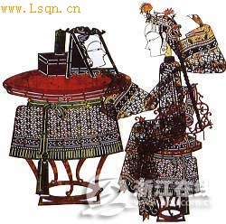 在晋南皮影戏里,各种传统的图案福禄寿、五子夺魁、魁星点斗、八仙庆寿、麒麟送子、连生贵子常常出现在影人及道具中。人物服饰上世常见各类建筑、器具上的传统纹样。《含嫣梳妆》表现了少女端坐于镜前调朱弄粉的情景。皮影艺人巧妙地表现了少女梳妆时,镜中人与镜外人的照应,在上演时,二者动作的一致更显出艺人的匠心独运。富有晋南风格的皮影雕刻玲陇,彩绘精致的桌、椅、箱、柜及古朴的器皿等有也疏密有致,既丰富又概括完整。少女的服装、桌、凳图案刻搂的精美细致令人由衷赞叹。