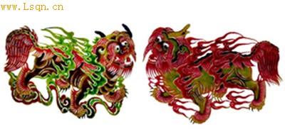 相传龙有九子,“吼”为其中之一,力大无比。剧写《西游记》火云洞红孩儿火攻孙悟空,各处火兽火鸟都来为他效劳。图为雌雄二吼带火上阵的形象。清代影,造型特奇,刀法流利,色调明快,实为难得的皮影珍品。