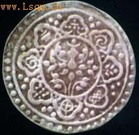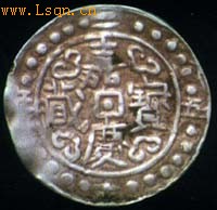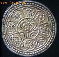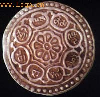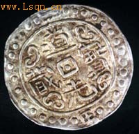 图三正面 图三背面 第一阶段:从诞生之日至19世纪末。此时藏币均为一钱币制的薄银片,分为皇帝年号币如乾隆宝藏、嘉庆宝藏、道光宝藏,以及章卡币两种(图三)。