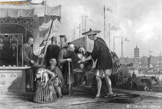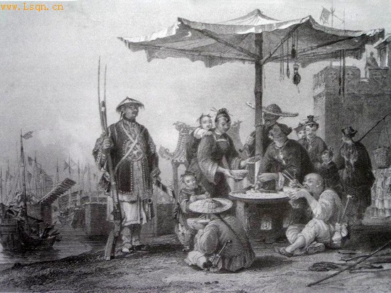 画面表现的是在大运河中牵引英使船只的纤夫们:在营兵火枪手的押解下,在运河边的饭摊上席地而坐,吃几碗稀饭而已,连咸菜也没有。有几段运河水道,民工们实在拉不动船,比步行还慢。英国使节们要求上岸,减轻吃重,兼着也散散步。这样,威廉-亚历山大才画到了一些岸上的情景,差不多已经是一幅乾隆版的《流民图》了。