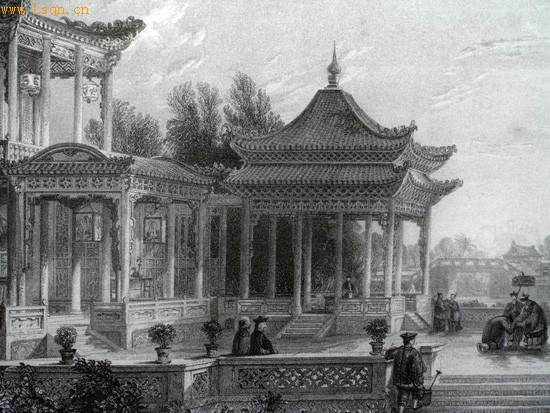 阿罗姆的这幅画可能是根据另外来源的观象台图稿画出的,它表现的不是观象台上面的设施情景,而是台下面钦天监和观象台的官员们生活、学习、工作的地方。这一部分就附属在高台的下面,也是皇家建筑,非常讲究堂皇。