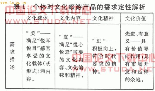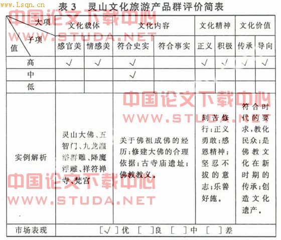 摘 要:旅游和文化具有天然的联系,所以景区在开发文化旅游产品时必须要做到使旅游产品与特定的文化元素水乳交融,在当前文化旅游产品供需升温的形势下,一个很关键的问题摆在了旅游理论界和企业界的面前,那就是如何评价文化旅游产品的优劣,主要围绕文化旅游产品的文化性评价体系构建展开,同时作为实证研究,在实地调研的基础上具体分析了无锡灵山文化旅游产品开发的成功案例。 关键词:文化旅游产品;评价体系;无锡灵山 1 关子文化旅游产品的界定 旅游产品具有明显的文化属性,但本文将要论及的文化旅游产品并不是泛泛地去谈所有涉及文化的旅游产品,本文所涉及的文化旅游产品是指具有鲜明文化特色的旅游产品,主要是包含了一个或多个文化领域的旅游产品。例如,宗教文化旅游产品、传统文化旅游产品等。无锡灵山景区就是以佛教文化为核心实施文化旅游产品开发经营的典型案例,下文将会对其作深入分析。 2 文化旅游产品评价指标的提取 文化旅游产品评价体系的构建必然依赖于指标体系的科学构建,因此本文首先要以文化旅游产品评价主体的需求分析为依据提取出几个关键评价指标,当然,评价指标的确立也会参考人类文化学领域的权威专家的理论研究成果。 2.1 马林诺斯基对文化产品的评价带给我们的启示 人类文化学大家马林诺斯基的文化功能主义思想,主要是将文化的构成元素按照它们各自在文化形成及发挥作用中的功能进行了解构。马林诺斯基将文化划分为物质层面、精神层面、语言和社会组织四个层次或元素,这是他的文化理论与其他学者的重要区别,即对文化进行解剖,根据这一思想,我们可以具体地将现实中的文化产品划分为文化载体、文化内容、文化精神和文化价值四个层次。如图1,所示,我们可以按照人们的审美需求给出一个层次图,任何类型的文化产品都可以分解为这四个层次,本文所研究的文化旅游产品也不例外,由此,我们可以借鉴这一观点,抽象出一个以这四个层次划分为核心的文化旅游产品评价指标体系。 2.2 文化旅游产品不同评价主体的一般审美需求分析 在此,本文将文化旅游产品的评价主体划分为两大类。即个体和组织。个体就是指对文化旅游产品的消费者群体,或称游客,组织主体就是指社区、城市、国家等对文化旅游产品有需求的组织,接下来,本文就对这两大类评价主体对文化旅游产品的需求作简要分析。 2.2.1 个体对文化旅游产品的需求分析 个体对文化旅游产品的需求动机主要有感官感受和心里感知两大部分构成,这也是多数旅游美学理论家所认同的观点,陈宗海先生从人的心理机制出发,总结出了旅游审美的四大心理要素,即感知因素、想象因素、情感因素和领悟因素,同时,他还将人们的旅游美感划分为三个层次:悦耳悦目——直觉感受;悦心悦意——审美领悟;悦神悦志——精神升华,其中,感知因素主要是与文化旅游产品本身直接相连接的,对应于上文提到的文化载体和文化内容,而情感因素和领悟因素则与文化精神和文化价值相连接,这种分析,主要是从人们建立在特定文化上的审美心理过程的角度展开的,是一种定性分析,根据图1对文化的层次划分,我们也可以将作为文化产品子集的文化旅游产品做同样的划分。因此,个体对文化旅游产品的需求分层可作如表1所示的定性归纳。 这一划分并没有借助数量分析法,而是依据多数学者的研究成果和个体的一般心理需要所做的定性概括,我们可以简单地用图2来解析个体对文化旅游产品的审美层次及需求。由于个体的审美素养和审美性格的差异,不同的个体在看到同样的文化旅游产品时的感受是有很大差异的,比如,审美素养差一些的个体在看到故宫建筑群时,他可能仅仅是看到了这座宫殿的恢弘气势和雕梁画栋的装饰,而一个审美素养较高的人(比如一名古建筑学家)可能很快就能沉醉在故宫巧夺天工的建筑艺术之中,就算是同一个体,在不同的时间点看到同一文化旅游产品也会有不同的审美体验,第一次一般只会停留在表面印象上即感官美,第二、第三次可能就会领会其文化内涵和神韵,因此,从个体审美过程的角度上讲,文化旅游产品是有很强的层次感的,优秀的文化旅游产品一般都会在表1所示的四个层次上(或其中几个)有独到之处。 2.2.2 组织对文化旅游产品的需求分析 近年来,上至整个国家,下至大小城市当局,无不在积极的寻求能够代表本国、本地区文化特色的旅游产品以提升形象、招徕游客等,我们把对文化的此类需求归入组织需求之列,其与个体需求既有联系也有区别。二者之间的联系在于,组织对文化旅游产品的需求最终还是为了满足或迎合特定个体所组成的人群的需求,是个体需求的总和,二者的区别就在于,组织需求更多地是事先依据特定的文化价值观或精神给文化产品的开发和设计指明方向,然后通过整合的方式将其传播给目标群体。需要特别指出的是,组织对文化旅游产品的需求与组织的发展和利益密切相关,例如,国家对于宗教文化产品的需求主要是为了促进文化的多样性和全面繁荣。孔庙的修建就是一个典型的例子,它是国家借助孔庙这一文化载体去宣扬以儒家文化为代表的中华文化精神和文化价值观,关于组织对文化旅游产品的需求点的分析,我们可以用图3进行简要解析。  通过专家访谈和调研,我们发现,与个体相