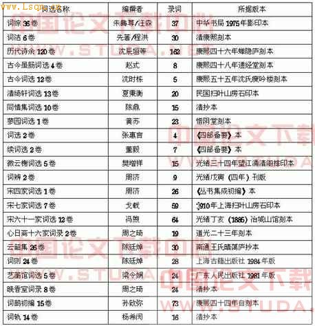 经历了元明两代的衰微期后,词在清代不仅重新焕发创作的活力,而且词学研究也极为兴盛,词籍的汇刻与校勘,词乐、词谱的整理研究,词话中词学理论的探讨等,其规模之大、成就之高均超越前代。清代词家众多,流派纷呈,各家各派往往通过编辑词选来标示风旨,借以创体构派。于是,清代词集选本不仅大量涌现,而且词选的功能也得到不断扩展,在传词存史的基础上进一步增强了理论色彩。周邦彦作为宋代词坛大家,在清代自然也得到了词选家们的特别关注和青睐。然而由于清代词派复杂,理论纷呈,也使得周邦彦词在清代通过选本的传播与接受,走过了一条跌宕起伏的道路。下面试取清代主要词选,列表加以考察分析:
