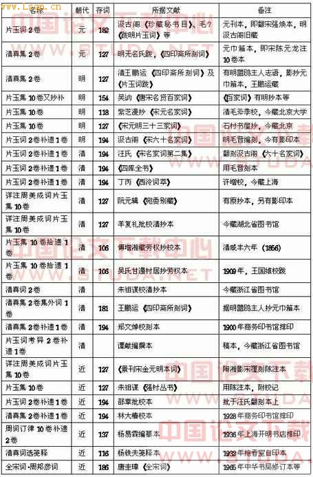 周邦彦词集在元、明、清各代皆有多种版本在继续传播。据今人研究和统计,元、明、清各代至近现代编刻流行的周邦彦词集亦达20余种之多。现列表如下: