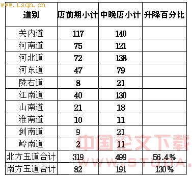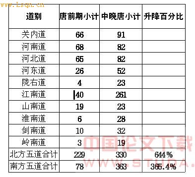 期各道分布统计知,关内道前期为4人,中晚期为1人;河南道前期为8人,中晚期为2人;河北道前期为5人,中晚期为2人;河东道前期为3人,中晚期为2人;江南道前期为1人,中晚期为6人 95 。可见北方各道人物由前期向后期在递减,而南方之江南道人物由前向后在大幅度递增。冻国栋又据日人平冈武夫、市原亨吉编《唐代的诗人》及平冈武夫、今井清二编《唐代的散文作家》,还有徐松编《登科记考》等进行统计,兹引用三表如下 96 :