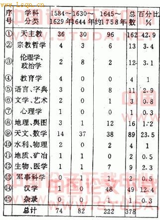 明清耶稣会士著译图书所涉及的学科相当广泛,详情如下表所示: