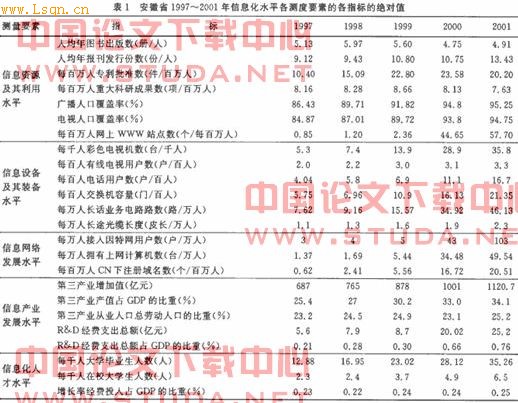 以网上WWW站点数可作为现代信息资源的代表,以“每百万人网上WWW乃万站点数”作为测度的指标。对传统文献信息资源可选取“人均年图书出版数”、“人均年报刊发行份数”、“每万人专利批准数”、“人口覆盖率""4项指标. 2、信息设备及其装备水平。主要是测度社会信息化的硬件水平。具体有6项指标:由于我省的统计资料中没有电视机的数据,只有彩色电视机的数据,所以只好以“每千人彩色电视机数”作为测度的指标;“每百人电话用户数”,这一指标包含了固定电话用户数和移动电话用户数;“每百人交换机容量”指标中包含长途交换机容量和局用交换机容量;“每百人拥有计算机台数”是一项重要的测度指标,但我省的各种统计数据中没有其统计资料,所以只好舍去。其它3个指标是“每百人有线电视用户数”、“每万人长话业务电路路数”和“每万人长途光缆长度”。 3、信息网络发展水平。信息网络是一国或一地区重要的信息基础设施,是网上信息资源发挥作用的必备前提。用于信息网络发展水平测度的指标很多,但由于统计资料的限制,本测度要素只选取“每万人接人网特网用户数”、“每万人拥有上网计算机数”和“每百万人CN下注册域名数”这三个比较容易获得数据的指标作为测度对象。其中第一项指标可以从本省的各个年度的统计公报中获得数据,第二和第三项指标在本省各种统计中没有数据,其数据是根据信息产业部网站中“统计信息”栏中的全国1997~2001年的信息产业统计公报中统计数据,根据安徽省所占的比重而估算出来的。 4、信息产业发展水平。其测度指标为“信息产业增加值”、“信息产业产值占GDP的比重”、“信息产业从业人口占总劳动人员的比重”、“信息产业R&D经费支出总额”、“信息产业R&D经费支出总额占GDP的比重”项指标。但由于信息产业渗透到社会其它产业之中,因此,无法把它们作为测度指标。由于第三产业包含了信息产业,所以选取“第三产业增加值”、“第三产业产值占GDP的比重”、“第三产业从业人口占总劳动人口的比重“R&D经费支出总额“R&D经费支出总额占GDP的比重n$项指标作为测度指标。 5、信息化人才水平。信息化建设需要高素质、技术全面的人才,信息化人才的培养离不开教育。因此,本测度要素的测度指标选取“每千人中大学毕业生人数”(是指拥有大专和大专以上毕业文凭人,其中包括成人教育毕业生)、“每千人在校大学人数,’(含普通高校在校生人数、成人高校在校生人数和研究生人数)、“教育经费投人占GDP比重3项指标作为测度指标。 二、安徽省社会信息化指数的测算 本模型中的各项指标的原始数据来自于1997 ^-2001年《安徽统计年鉴》,1997-2001年《安徽统计公报》、信息产业部网站统计信息栏中的统计公报和国家信息化测评中心网站中的统计信息.在原始数据的基础上,按照各指标的条件,经过换算得到各年度各指标的绝对值(见表1)。