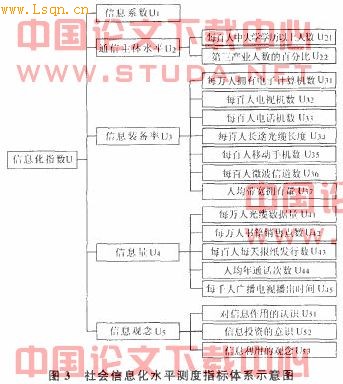 . 8信息化递阶多层次灰色测度指标体系 该指标体系将信息化的测度划分为信息资源、信息产业、信息设施、信息应用、信息人才、信息政策等6部分。 信息资源包括12个指标:人均数据库数量,人均网络(域名)站点数量,人均科技成果数量,人均专利数量,人均商标数量,人均电子出版物数量,电视播出时间,广播播出时间,人均邮电业务,人均报刊发行量,人均图书出版量,人均图书馆拥有量;信息产业包括4个指标:人均信息产业国内生产总值,信息产业增加值占GDP比重,人均信息产业基本建设更新改造投资,人均信息产业新增固定资产;信息设施包括8个指标:计算机网络密度,计算机网络设备普及率,电信网络密度(光缆、微波、卫星),电信设备普及率(交换机),邮电局分布率,广电(电台、电视、有线电视)普及率,广电设施覆盖率,人均信息建筑业产值;信息应用包括13个指标:人均国家重大信息工程项目投资额,行业信息化率,行业信息系统普及率,人均行业信息投资额,人均信息消费额,人均信息消费比重,互联网普及率,软件普及率,计算机普及率,电子信用卡普及率,手机传真电话普及率,POS, ATM普及率,电视有线电视普及率;信息政策包括4个指标:信息化组织机构,信息化政策、规划、法规、标准,科研经费投人率,信息产业投资率;信息人才包括4个指标:信息产业人员比例,政府部门、其他行业信息技术人员比例,科研人员比例,高校教工、学生比例。 3其他理论基础之上的综合信息化水平测度指标体系 3. 1综合信息产业力度法 综合信息力度法是采用层次分析法,采用多个指标,从信息产业发展的潜在力、信息产品开发力、信息产业生产力、信息资源流通力、信息资源利用力等方面,反映信息产业在整个国民经济中所占比例的信息产业平衡力,以此去测度信息产业的发展情况。这既考虑了信息产业在国民经济中所占比重,又考虑了各产业间的比例关系,具有科学性。综合信息力度法决不是此六种力度的简单相加,而是各种力的合力,是一个有机的综合体。 综合信息产业力度指标体系是参照波拉特理论,运用现代科学方法的对称性原理与简单性原理,依据牛顿第二定律设计的。在测算中又运用模型性最小原则及平均值处理数据,因此具有理论的合理性。 3. 2二元经济条件下的社会信息化水平测度指标体系 在指标体系的设计上,它采用了符合现代信息社会发展特征的指标体系,并且对城市及农村采用同一套指标体系,体现了城乡信息化发展最终合一的趋势。城市与农村之间的发展阶段的差异主要由指标权重的差异来体现。该指标体系分为三个层次,如下页图3所示。