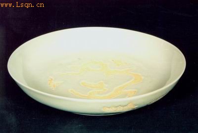 高4.5厘米、口径22.6厘米、底径14.5厘米。 口微撇,浅腹,腹壁呈弧形,平圈足。盘内刻划一龙,龙与朵云部位略凹未施釉,龙与朵云呈浅桔黄色。胎薄质细,色洁白微闪青,造型、纹饰设计制作精巧。盘底书有“大明正德年制”竖排双行青花楷书款。