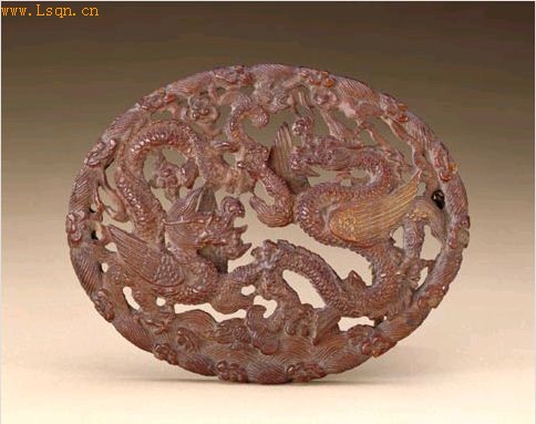 直径15-11.8cm,厚1.1cm。 此犀角饰件是取用非洲犀角横截一大片镂雕而成,当是如意瓦首或盒具上的嵌件。其切口色泽淡黄,板饰正面染色呈棕红色,并以镂刻技法将犀角片镂出海水纹椭圆形框,框内上为烟云,下为涌涛,云涛之间两条带翼应龙曲颈伸爪,相对腾跃,龙口大张,龙鼻上扬,龙发成绺状从双角中向前飘拂,龙脊的鳞纹也刻画得细密遒劲,加之染为棕红色,古色古香,使双龙显得尤为威猛苍劲。 此件犀角嵌件刻工浑朴,刀法娴熟流畅,将明代的雕刻技巧和时代风格表现得十分突出。