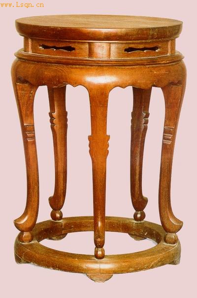 此几是寺庙中用以置放香炉、铜磐等法器的用具。其面用厚5.5厘米的整板作成,在束腰部位嵌入绦环板,并配以近似海棠式的透孔,此种工艺手法是明代家具的典型,它打破了整板和大面积板面的沉闷,显示出玲珑活泼的趣味。在足与足下木框之间,又饰以圆球,更增加了该几的实用性及美观性。