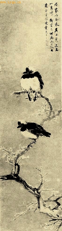 《慈乌图》纸本,水墨,乃沈周不多的写意花鸟画中的精品,现藏南京博物院。图绘雪中的一段乔木折枝上,栖息着两只慈乌。“S”形的构图,极其简略,不过占据了三分之二的画面,上面是题诗:“君家好乔木,其上巢三乌。一乌冲云去,两乌亦不孤。出处各自保,友爱常于于。沈周。”诗助余兴,原先乔木上栖息了三只“慈乌”——一种胸部白色的乌鸦,能反哺其母的仁鸟——但一只冲天而去,不见了踪影,现在只剩下两只,缩头夹尾,栖止在积雪的残枝上,尚能互为呼应,友爱相守。情景冷漠萧瑟,但两只相互依存的鸟,仍给人带来了脉脉温情。这里是否也有沈周之所“寄兴”?不得而知,但图上的题诗,确也给人留下无尽的遐想余地。这也正是文人画的一大特点。而在笔墨上有很大的创新:树干粗处,依然用双勾,但细枝,乃一笔提、按、顿、折地“写”去,然后加小枝以区分疏密。两鸟通体不勾轮廓,只是极简洁地以黑、灰墨色勾、点、染出鸟身的结构,依然形正而生动。这也就是“写意”——写其大意的绘画方法。然后在整幅画面上染淡墨色,以“留白”法映衬枝上的残雪和慈乌头、腹的白羽。