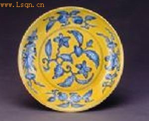 黄地青花是在白瓷胎上画好花纹后,施白釉高温烧造,再于白釉处填上低温黄釉,入炉低温烧成。此品种创烧于明宣德时期,流行于成化至嘉靖时期。