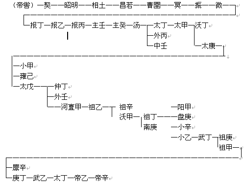 这个完整的世系,是不太可靠的,特别是成汤以前,更是如此。例如:振,《天问》作该,《世本》作核,《人表》作垓,而甲骨文作亥。微,《国语》作上甲微,甲骨文作上甲。报乙、报丁、报丙,甲骨文作?、?、?、?古方字,读与报同。主壬、主癸,甲骨文作示壬,示癸,主也是示字之讹。而且,《殷本纪》所列世系,与甲骨文世系次序也有出入(前者报丁在前,后者报丁在报丙后)。可能这些都是后世追述而有讹误。现在研究起来,不会有什么结果,所以存而不论,汤以后,建立了统一王朝和奴隶主的国家,子孙对于世系的保存较确,所以甲骨文与《殷本纪》基本上是相同的,但是甲骨文只记直系,而《殷本纪》却注明了兄终弟及的情况。