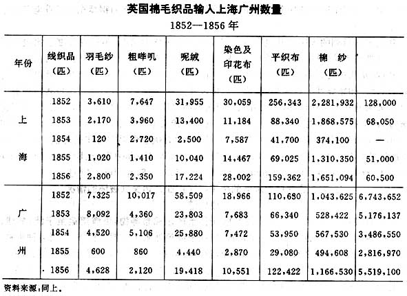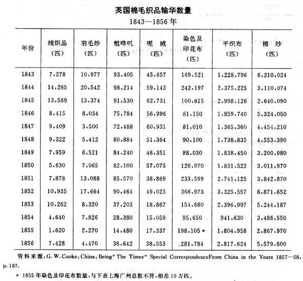 首先,这些数字显示了英国对华输出没有稳健的增长,前途没有什么希望。一八三八年[数字省略]和一八四四年输出的毛织品(worstedstuffs)都比去年(一八五六年)多一倍,而一八五二年输出的羽纱(camlets)则为一八五六年的四倍。粗哗叽(longells)出口从九万匹(一八五一年)降为三六、六四二匹(一八五六年),而呢绒(wool-lens)则从六八、○四二匹(一八三六年)降为三八、五五三匹(一八五六年),染色及印花布(dyedandprintedcottons)最后两年的数字转高;而印花布和棉线(cottontwist)的出口一八五三年曾大为下降。