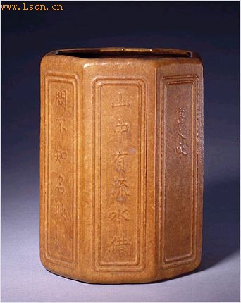 高15.5cm,径11.5cm。 笔筒以八棱柱分隔为八方形,口微内敛,造型朴素清雅。筒身八面刻阳文楷书唐诗一首: 山中有流水,借问不知名。 映地为天色,飞空作雨声。 转来深涧满,分出小池平。 恬澹无人见,年年长自清。 此为唐代诗人储光羲的《咏山泉》诗,表达了作者隐逸自娱的情怀。器底字迹模糊不清,隐约可辨“康熙赏玩”款识。