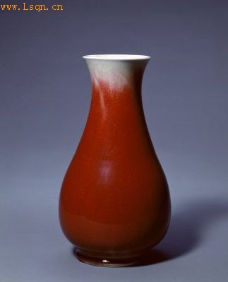 郎窑红釉是由清代康熙时期江西巡抚郎廷极(1663—1715年)督理景德镇窑务时所创烧,故名郎窑红。它是在模仿明宣德宝石红釉基础上的一种高温铜红釉,因釉色浓艳,如初凝的牛血,故又称“牛血红”。它是以氧化铜为着色剂,经1300℃以上的高温还原焰焙烧而成。烧造过程中对烧成的气氛、温度等技术指标要求很高,烧制一件成功的产品非常困难,所以郎窑红釉瓷器在当时就很名贵,民谚有“若要穷,烧郎红”的说法。