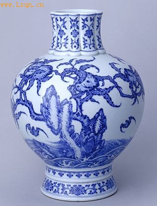 高25.5cm,口径7.5cm,足径10.8cm。 瓶花口,瓜棱式颈,溜肩,圆腹,圈足微外撇。颈部绘折枝花卉,腹部绘一株桃树,树枝上结有数枚寿桃,树下绘山石与江崖海水纹,空间绘飞蝠,近底处绘变形如意头和折枝莲纹各一周。足内青花篆书“大清乾隆年制”六字款。 此瓶造型构思奇巧,青花浓重艳丽并有晕散,具有仿明代永、宣青花的艺术效果。纹饰为吉祥图案,寓意“寿山福海”。