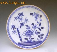 盘敞口,圈足,盘外壁施酱色釉,盘内青花绘竹子、牡丹图案,构图疏朗、简练。
