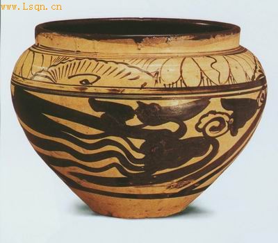高19.3厘米、口径21.8厘米、底径10.3厘米。 1957年安徽临泉出土。 大口,丰肩,平底内凹。内部施黑釉,外部在白釉上绘黑花。肩部饰莲花、荷叶,腹上绘飞凤纹。纹饰古朴,线条粗犷,具有浓郁的民间色彩。造型稳重,当属磁州窑风格的产品。