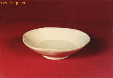 敞口,口沿作花瓣形,浅腹,圈足。里底一圈凹弦纹,外壁上端压五道棱纹状花瓣。胎薄,釉白。