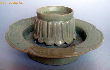 该器形似一朵盛开的莲花,倒置于盘中。整器托座、承盘和底足三部分组成。托座为莲蓬状,内底中间为一倒扣杯形,杯外壁塑覆莲瓣一周。
