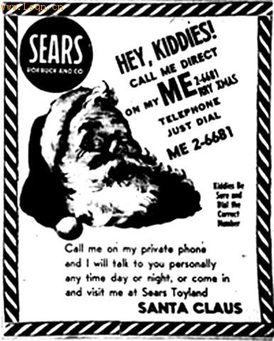 NORAD怎么开始这项“副业”的呢?这个故事还得从1955年说起。当时美国零售业巨头西尔斯-罗巴克公司为了搞噱头,在一则广告上鼓励小朋友给圣诞老人打电话,并留下了电话号码。但由于广告印刷错误,这个电话变成了NORAD的前身“大陆防空司令部”(CONAD)的号码。