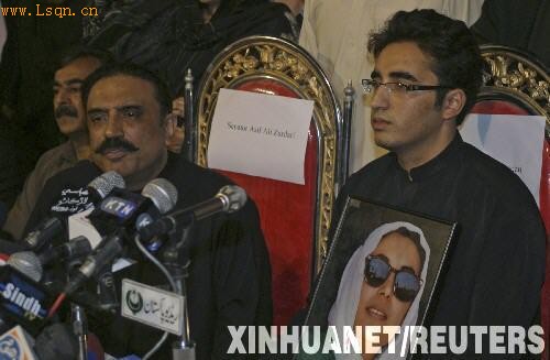 贝娜齐尔·布托2007年12月27日在竞选集会上遭遇自杀式袭击受伤,不治身亡。19岁的比拉瓦尔遵照母亲贝·布托的遗嘱,成为了巴基斯坦人民党的新一任党主席,他也成为了巴基斯坦的政治大家族布托家族走出的第四代政治领导人。图为2007年12月30日,巴基斯坦前总理贝·布托的丈夫阿西夫·阿里·扎尔达里(前左)和儿子比拉瓦尔·扎尔达里(右)出席在巴南部瑙德罗镇举行的一个记者招待会。WWW.lSqn.cn
