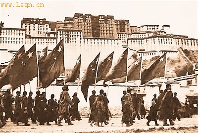 宋_GB2312 color=#000080>解放军进驻拉萨的先遣部队手持国旗走过布达拉宫广场。
