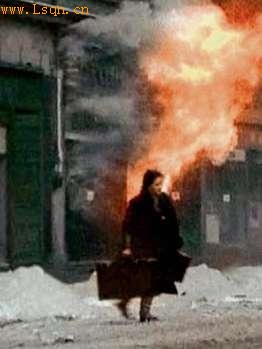 1945年,一个德国女人从她着火的房子里逃出来。