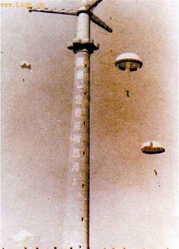初创时期的空降兵,仅有从原苏联购买的300具降落伞,缴获的几架美制C-46飞机和原苏联的伊尔-12飞机,数量少,机型旧,而且破损较为严重,根本无法满足空降官兵跳伞训练的需求。于是部队采用了古老而原始的跳伞方式——伞塔跳伞。那时,能坐上飞机跳伞简直是伞兵梦寐以求的事。