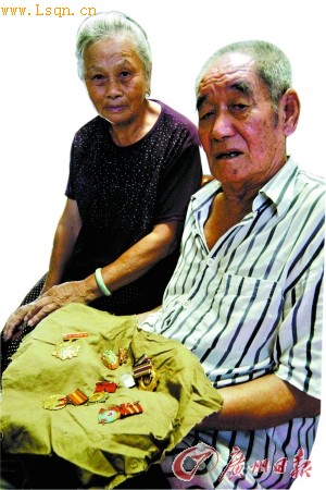 李铭与老伴合影,展示自己过去获得的勋章。