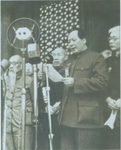 除此而外,还见几种比较特殊的开国纪念章:中英文开国纪念章,银质,直径4.2厘米,正面镌刻有毛泽东半身头像,背景为天安门,沿纪念章上下边缘刻有“毛泽东主席”英文和繁体中文,背面绘有中国地图,地图上方是五星红旗,下方注明开国大典时间:“1949.10.1”,边缘刻有“中华人民共和国”中、英文;双重意义纪念章,1949年11月“世界工联亚洲·澳洲工会会议”、12月“亚洲妇女代表会议”先后在北京召开,瓷都景德镇为大会特制了陶瓷纪念章,作为礼品分赠参加大会的代表。纪念章正面绘有斯大林、毛主席、朱德像,题写有相应文字,背面有“中华人民共和国开国纪念”和“1949.10.1”等铭文,具有会议纪念和开国纪念双重意义。