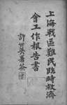 救济工作。在短短三个多月中,该组织救护难民30余万;其中经该会救出险境者有75004人,完全提供给养的人数达135094人,经该会与其他团体合作遣往各地的难民人数多达137151人。工作结束后,为向社会各界详细报告该组织工作情况,以昭信用,1933年上海战区难民临时救济会编辑出版了该会工作报告书。