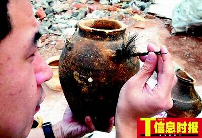 border=0> 明代青瓷花碗上刻有“海幢”,可能是寺院僧侣的生活用品 珠江南岸首现密集水井 除南越国时期的遗迹,还有20眼从汉代到宋代的水井,也是此次考古发掘的重要成果。考古专家表示,这是首次在珠江南岸发现分布如此密集的水井群。水井中出土铜、铁、铅、木、瓷、陶等不同质地的文物200余件(套),为罐、瓮、碗、纺轮和网坠等生活用品。此外还有少量陶灶、水井模型等冥器。 值得一提的是,在一个西汉时期的灰坑中,发现一批烧制变形的陶器。其中,有的器形发生变化,有的和其他器具粘连在一起。考古专家判断,这批变形陶器来自工地西侧的海幢寺汉代窑场。据称,1996年在今海幢公园西侧、原明清海幢寺旧地,曾发掘出一个汉代窑场遗址,出土大量陶器。 此外,一个晋代酱紫釉陶罐颇引人注目,罐耳留有绳索。考古专家称,这些证明该罐是在汲水时跌落井内的
