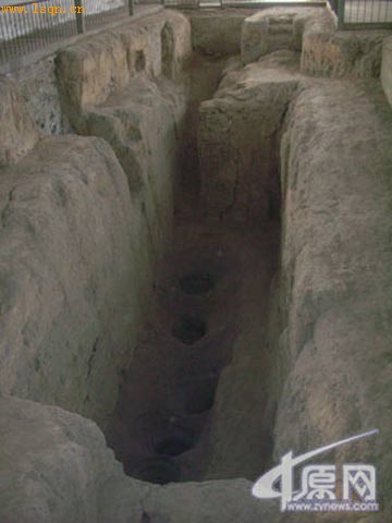 新郑市博物馆馆长杜平安介绍说,长方形竖井底部南北长8.7米,东西宽2.5米,深2.24~3.35米,在地下室的东南角筑有一条斜长7.3米、宽0.58~0.7米,共有13级台阶的通道,倾斜度为50度。“这种深入地下3米多,四壁又用夯土建筑,进入地下通道又窄又陡的建筑设计,是出于保持地下温度低于地上温度而考虑的。”