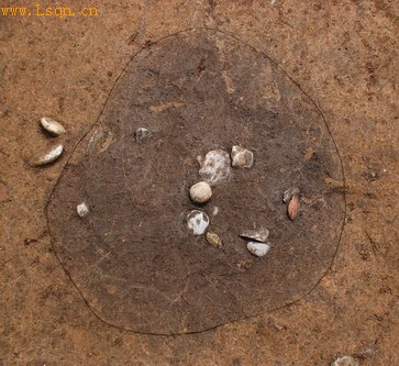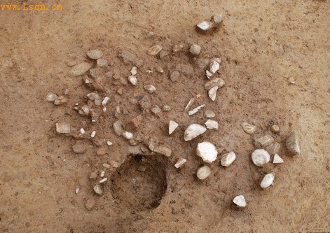 新石器时代遗存,遗迹较少。在300平方米发掘范围内仅发现3处灰坑及2处石制品较集中区。灰坑包含物以石制品为主,陶片少而碎,且多挤压呈饼块状分布(图八、图九)。石制品区仅在靠近断坎边的T3东隔梁及T3南部扩方内发现两处(图一O、图一一),而且伴随石制品出土的陶片亦相对较多,我们由此可推断,发掘区已是遗址边缘区。从灰坑及石制品区包含物分析,这种情形与金家园遗址极为相似,但不见后者小石籽坑遗迹。
