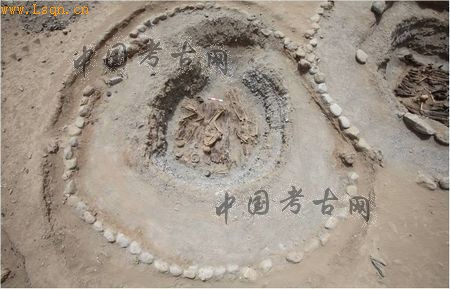 M12大致为南北向,整体呈现为椭圆形,墓葬由石围竖穴沙坑构成。南北长7米,东西宽6.8米,墓室南北长310cm,东西宽290cm,深约147cm。M12的外石围南北长590cm,东西长660cm,卵石直径为20cm—40cm;内石围南北长370cm,东西宽390cm,卵石直径为30—45cm 。石围的间距最宽处60cm,最窄处25cm。